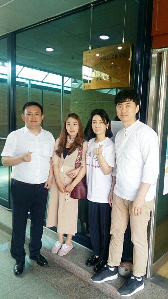 중국천진국립남개대학으로 부터 공식시험처라는 현판을 받고 기념으로 찍은 사진과 영어필기시험에 몰두해 있는 사진입니다.